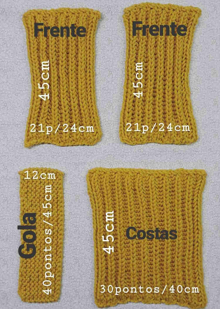 Gola: montei 40 pontos nas agulhas (45cm de largura) e trabalhei em cordões de tricô (ponto tricô nas carreiras de direito e avesso do trabalho) até atingir a medida de 12cm. Arrematei bem soltinho e pronto! Os quatro retângulos estão formados como na foto que mostro lá no alto.